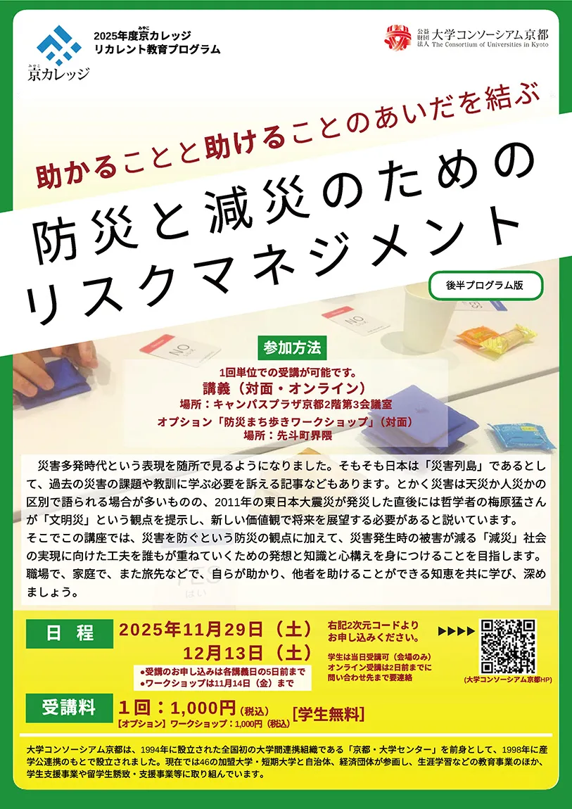 【Lecture】 ●8-time set: 8,000 yen (tax included) *One-time unit: 1,000 yen (tax included) [Options] “Disaster Prevention Town Walking Workshop”: 1,000 yen (tax included) *Free for students |