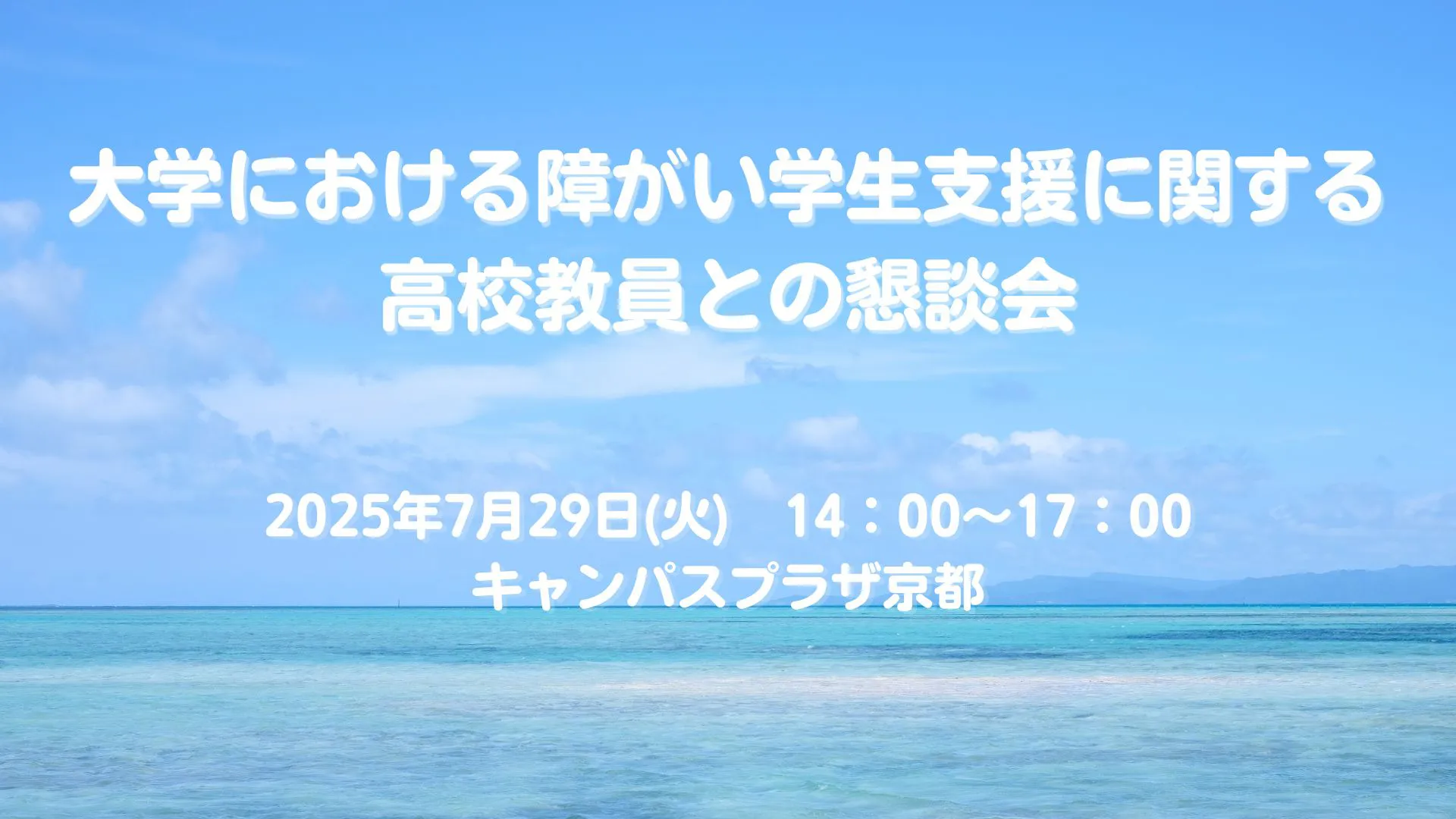 - For teachers at high schools who are involved in providing guidance and support, including education and career guidance, to high school students with disabilities (physical, mental, developmental, etc.), we will provide topics on the current state of support provided at universities (considerations during entrance exams, academic support, support systems within universities, etc.), and then hold discussion meetings in groups. We also aim to make this a meaningful discussion meeting for both sides, as it will be an opportunity for university faculty and staff to learn about the issues they face in terms of support and career guidance at high schools, as well as requests they have for universities.