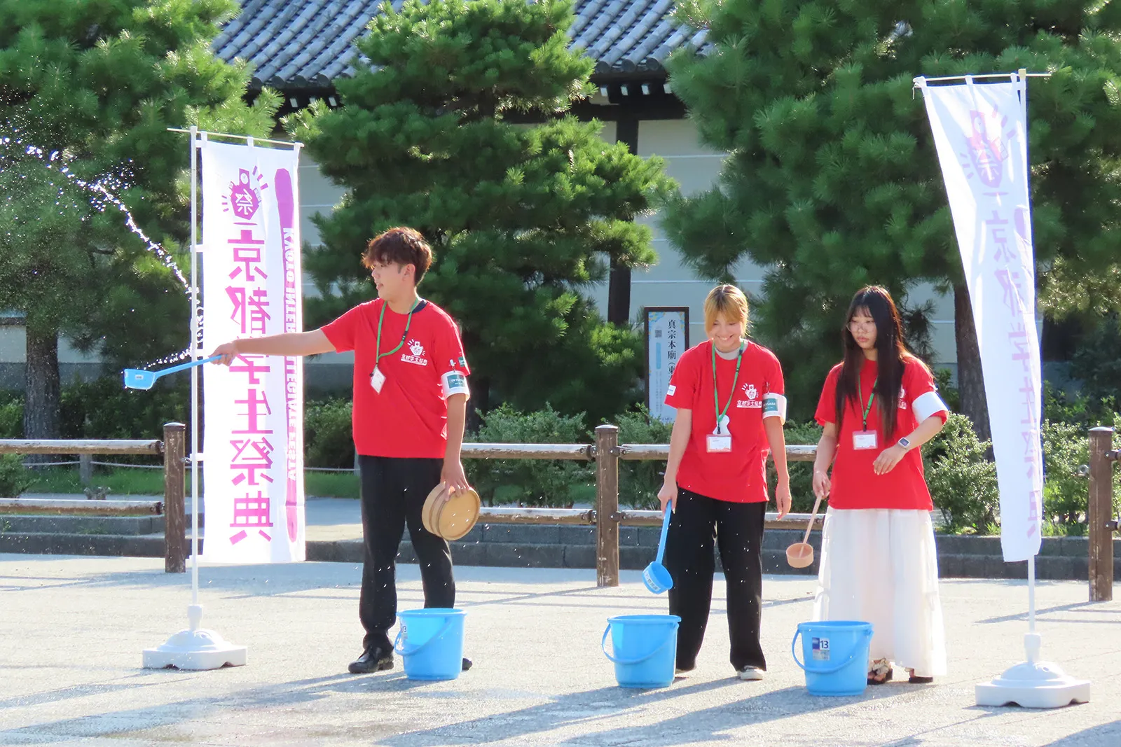 今年,為了提供源自大自然的涼爽,我們在東本願寺前和舉辦主要祭典的平安神宮前進行了噴水計畫。 節日當天,我們努力防止垃圾增加,例如在美食節上使用重複使用的餐具和安裝飲水機。
