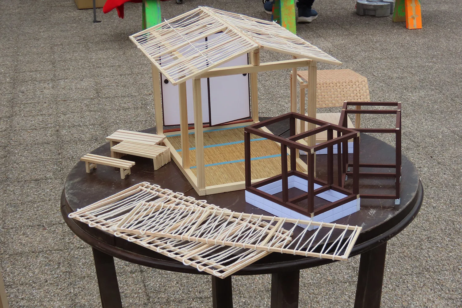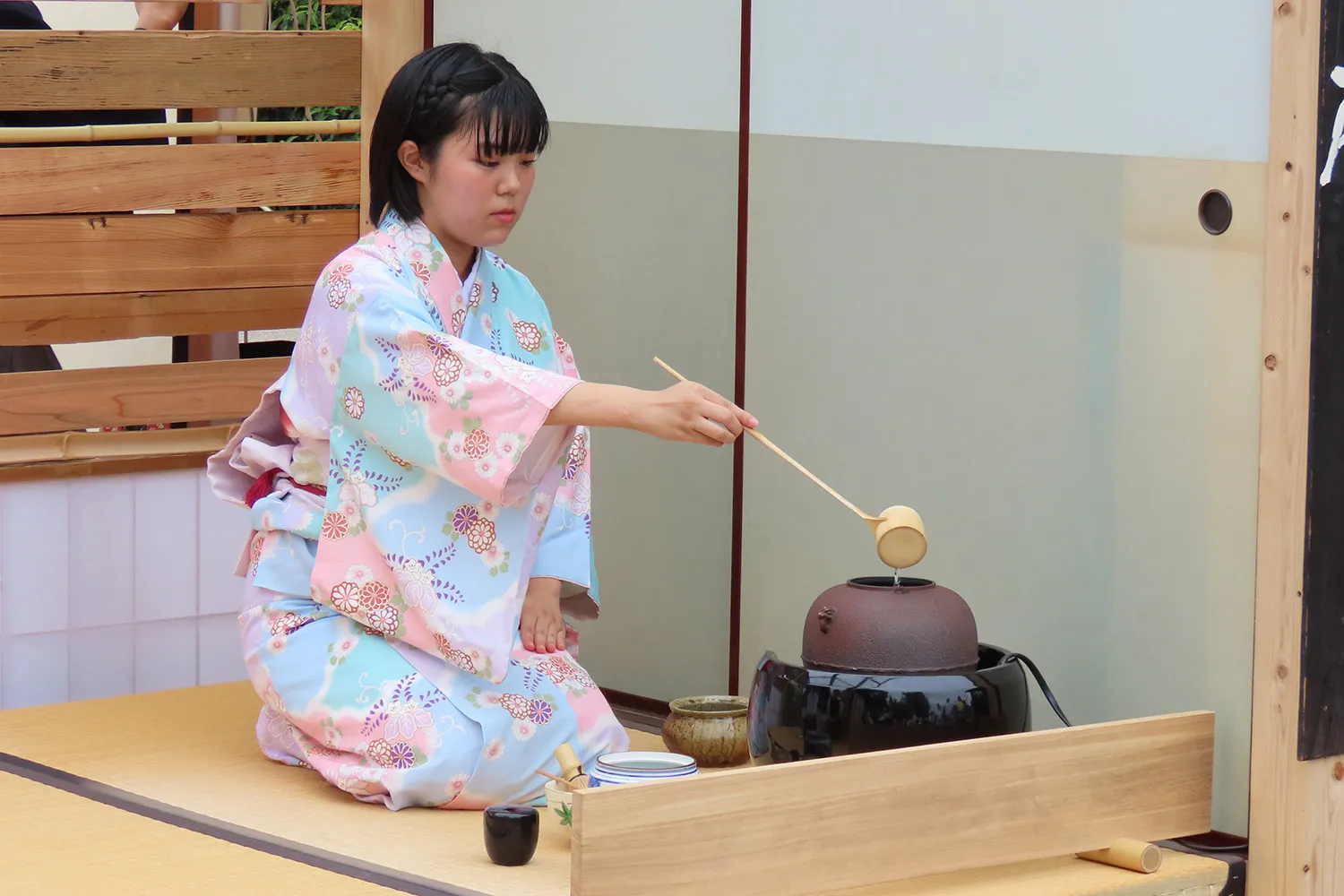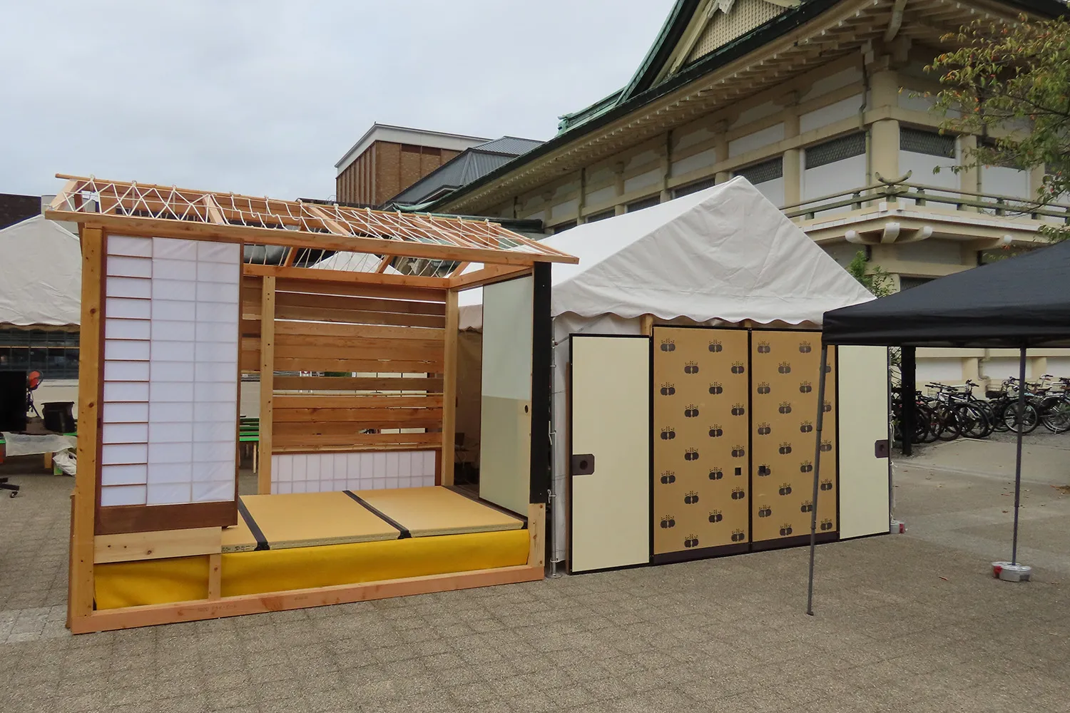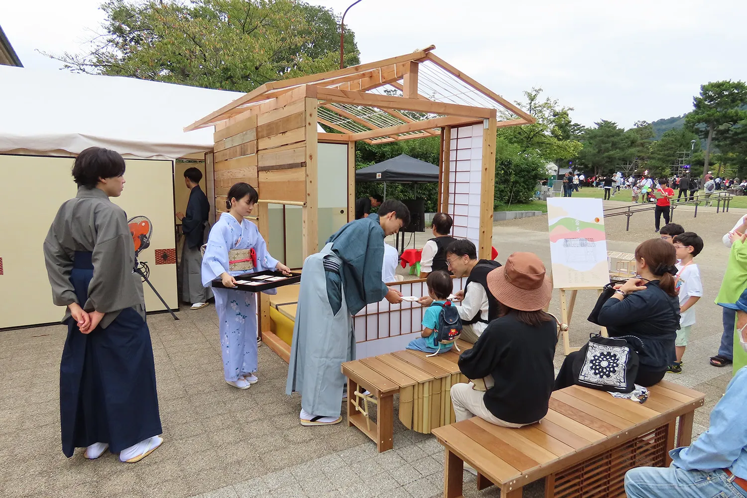 它是作為今年的亮點項目進行的。 京都產業大學茶道研究部「和心會」與京都造形藝術大學建築學院和藝術學院合作。 我們用京町家的廢料做了一個茶室,並舉行了茶道。 茶室是用拆除的京町家的廢木材建造的,被命名為“愛陽庵”(*),屋頂設計有許多扭曲的線,其理念是“讓它成為一個讓許多人可以連接心靈的地方”。 使用的茶葉來自著名的茶產地和束町,茶前使用的水是從下郡神社採購的。 這是一個融合了學生豐富思想和文化的項目。 此外,宇治茶的主要生產地京都府和束町的人們也展示了展位,介紹了和束町的舉措,並為遊客提供了茶葉。