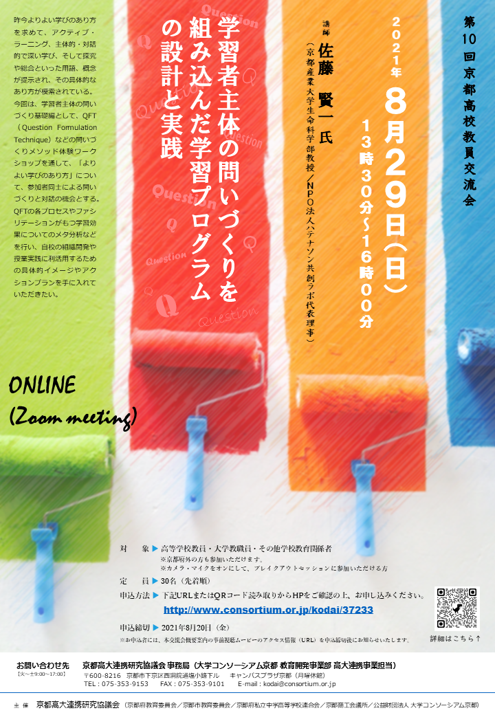 | 対 象 | 主に高等学校教員(高等学校の教員免許を取得している大学院生も可) ※京都府外の方も参加いただけます。 ※オンライン参加の場合、カメラ・マイクをオンにしてブレイクアウトセッションに参加いただける方 |