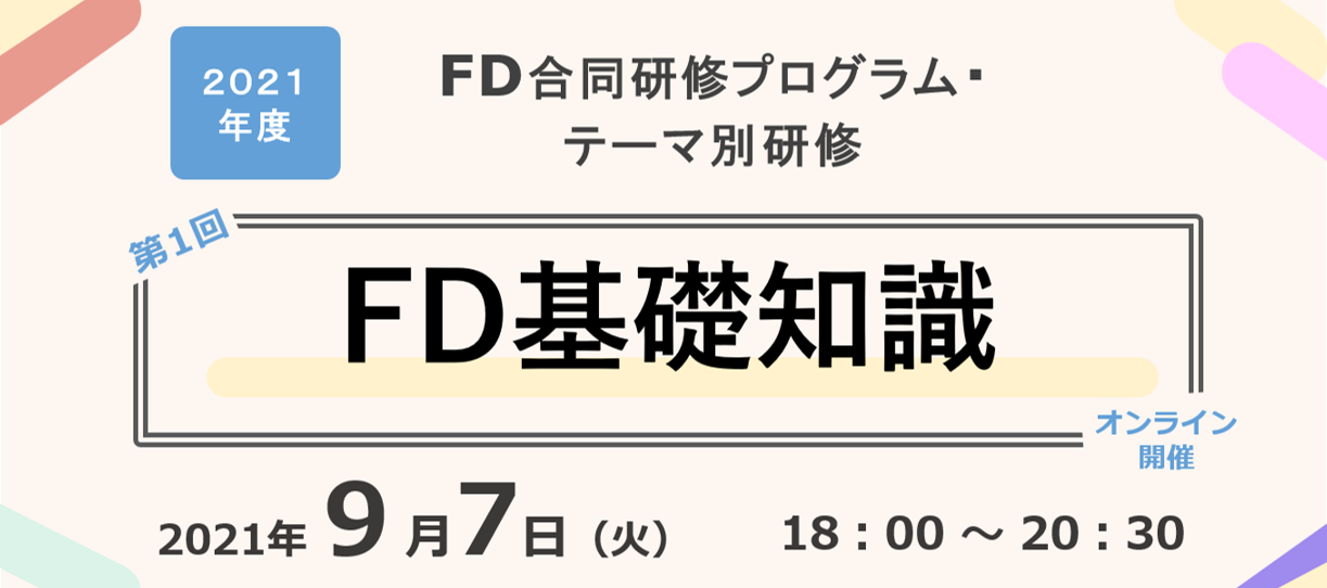 The FD Joint Training Program is a small-group training program for new teachers, teachers who want to relearn the basics of FD, teachers who are interested in FD, and staff working in FD-related departments to acquire basic knowledge of FD, syllabus creation, lesson design and practice, active learning, and grading. In FY2021, a total of six sessions will be held online (Zoom).