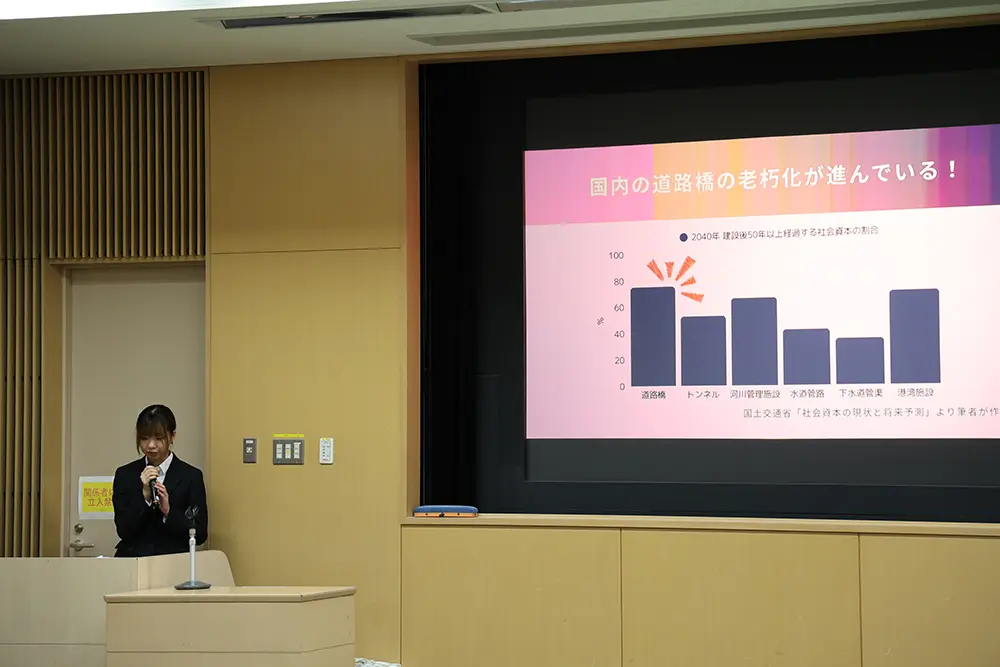 First, Ms. Aika Takada of the Faculty of Regional Management, Fukuchiyama Public University, who received the University Consortium Kyoto President’s Award, made a policy proposal titled “Possibility of Utilizing Bridge Risk Score for Maintenance and Management and Disaster Prevention Using Open Data: A Case Study Using Fukuchiyama City Bridge Data.” This proposal is a policy proposal that not only from the perspective of solving the problem of how the government will respond to aging bridges, but also from the perspective of utilizing bridge data from the perspective of disaster prevention. Administrative officials from Kyoto Prefecture and Kyoto City, who are actually in charge of bridge management, actively exchanged opinions, including advice on research and practical work at bridge repair sites.